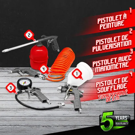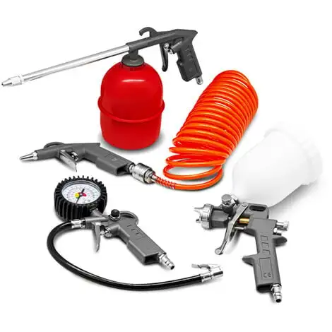 Ce kit de 5 accessoires pour compresseur de la marque Constructor reprend les outils pneumatiques les plus couramment utilisés avec un compresseur : 1 tuyau spirale vous permettant de travailler à une distance max de 5 M sans devoir déplacer votre compresseur, 1 pistolet peinture à godet supérieur d’une capacité de 500ml (buse 1.5mm) , 1 pistolet de pulvérisation avec récipient en acier de 600ml utilisé pour le nettoyage et l’entretien d’outils de jardin par exemple , 1 pistolet de gonflage avec manomètre utilisé pour le gonflage des pneus, des ballons…. et 1 soufflette permettant d’éliminer les poussières, les sciures…