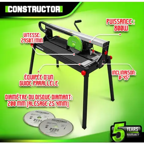 Cette table coupe carrelage radiale électrique 800 W de la marque Constructor est idéale pour la coupe rapide et précise de pierres et de carreaux muraux et de sol en céramique. Elle possède un disque diamant de 200 mm de diamètre et peut couper jusqu’à 35 mm de profondeur (90°). Le disque est refroidi à l’eau afin d’obtenir une coupe précise sans poussière et une plus longue durée de vie du disque.